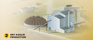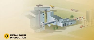 Dry Kaolin is fed into a rotary dryer and transformed into Metakaolin through dehydroxylation at temperatures up to 850°C. Finished product is then cooled and conveyed to the storage area.