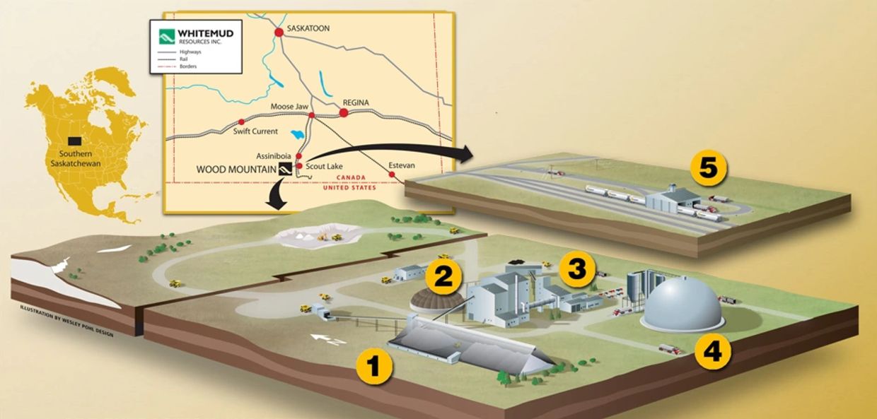 Whitemud Resources' mineral leases are large enough to run the production facility many years. The mine and processing facility at Wood Mountain are located near Assiniboia in Southern Saskatchewan, which is 225 kilometres southwest of Regina and 55 kilometres north of the Opheim-West Poplar U.S. border crossing.